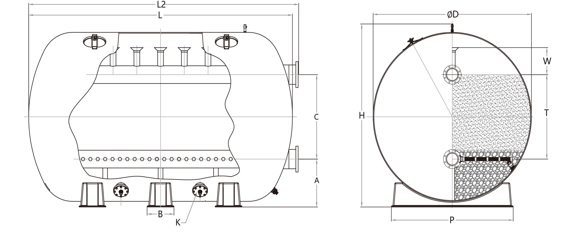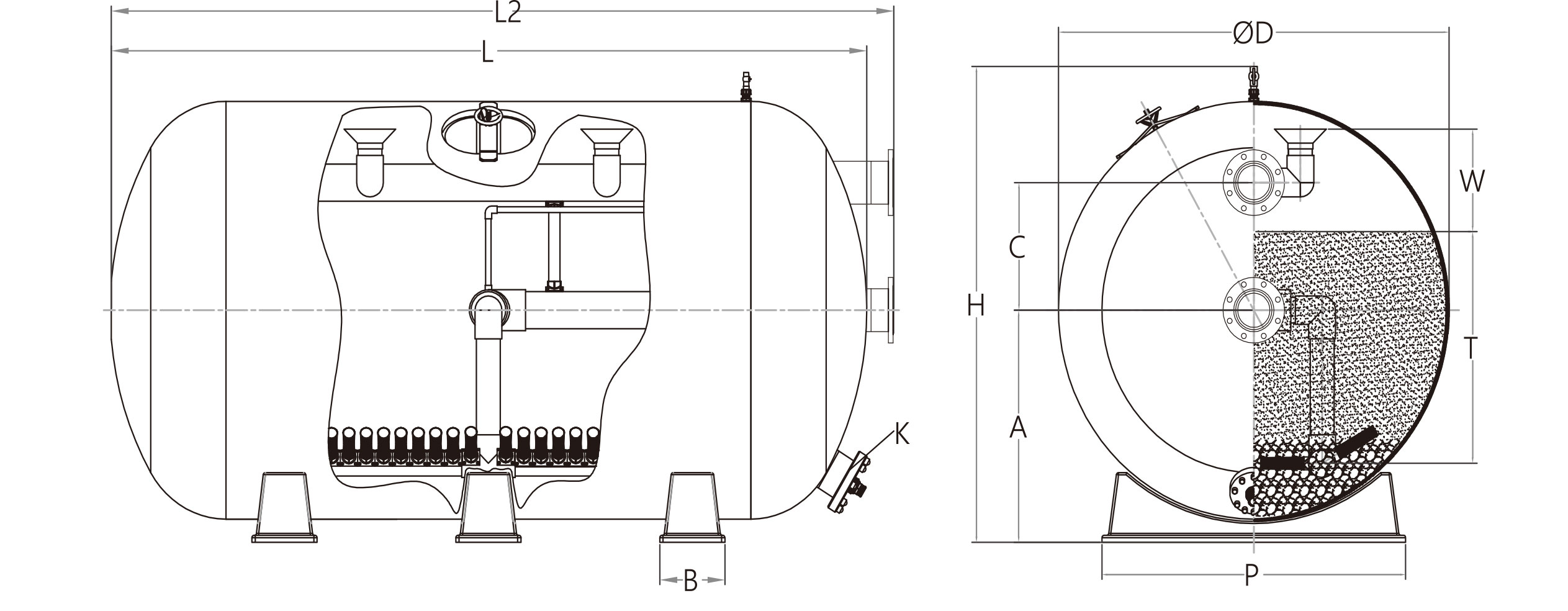 | 型号 | 缸体直径 | 缸体 高度 | 流速 | 出入水口径 | 设计流量 | 过滤面积 | 所需幼砂重 | 所需粗砂重 |